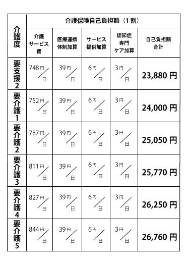 | 介護度 | 介護保険自己負担額(1割) | 実費負担額(全額) | 総合計 (月額) |